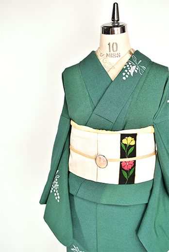 スモークグリーンの紬地に鈴蘭の花が付け下げ小紋のようにあしらわれた染紬プロムナード袷着物に、
